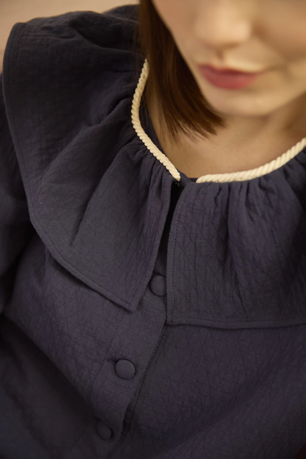 Detalhada com botões forrados e cordão trançado off white, Madeleine é uma blusa especial, que atravessa estações com elegância e suavidade.