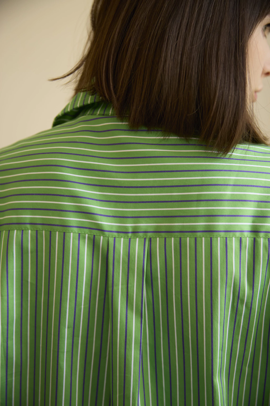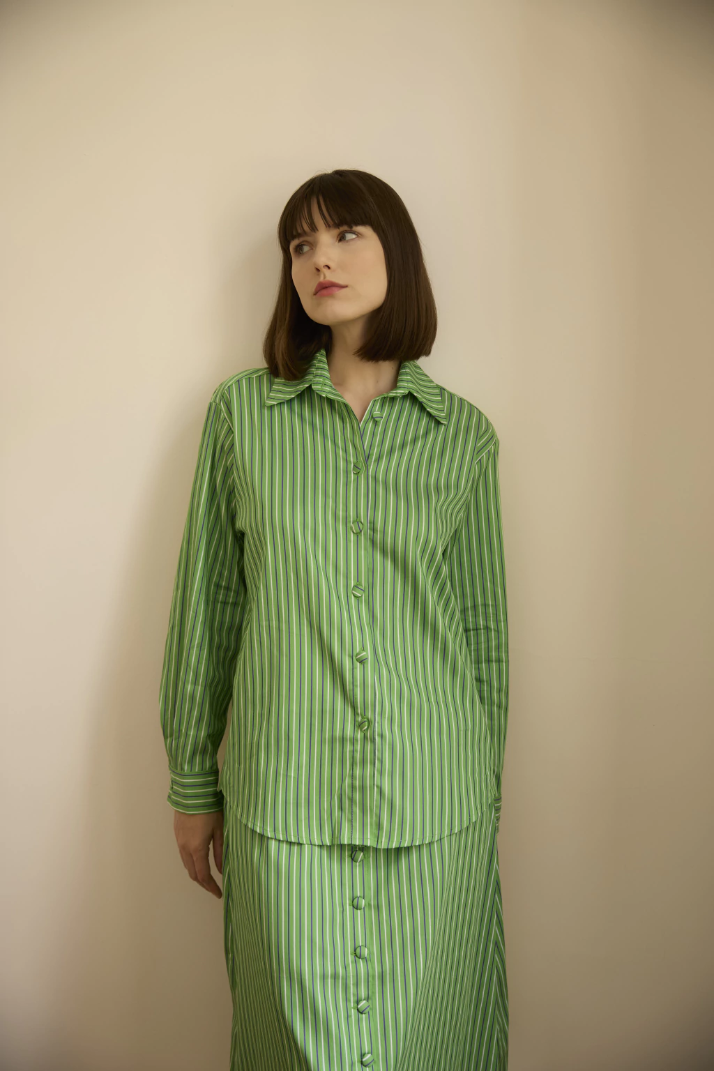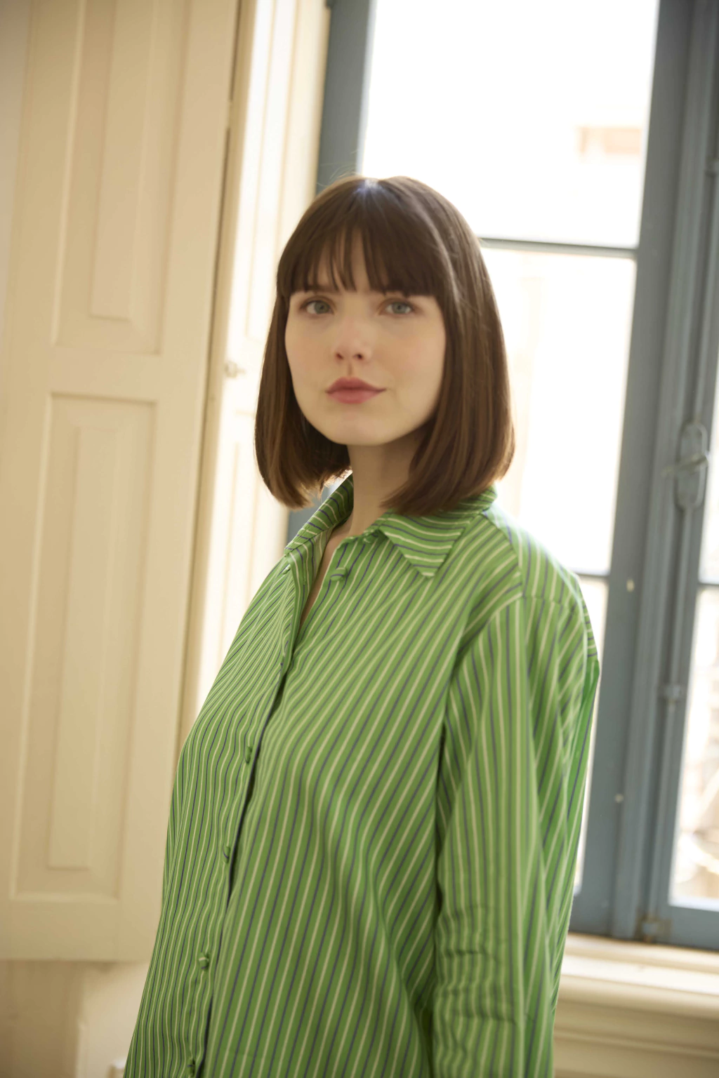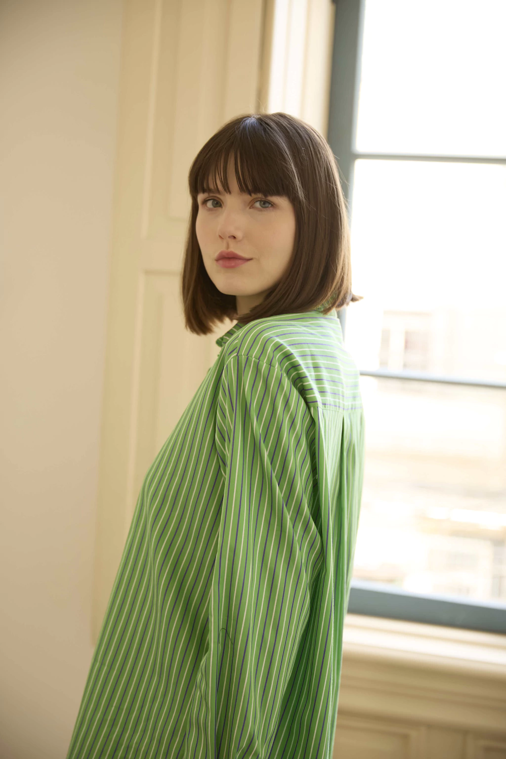 A Camisa Annette traduz o espírito da Collection Héritage: elegância natural e um toque de nostalgia francesa. Confeccionada em tecido de algodão nobre e acabamento acetinado, num tom verde listrado belíssimo na combinação exclusiva vert jardin e azul marine. Apresenta caimento leve e refinado, com textura encorpada e visual atemporal. O fechamento frontal com botões forrados reforça o cuidado artesanal presente em cada detalhe, enquanto a modelagem mais oversized valoriza o movimento e o conforto.