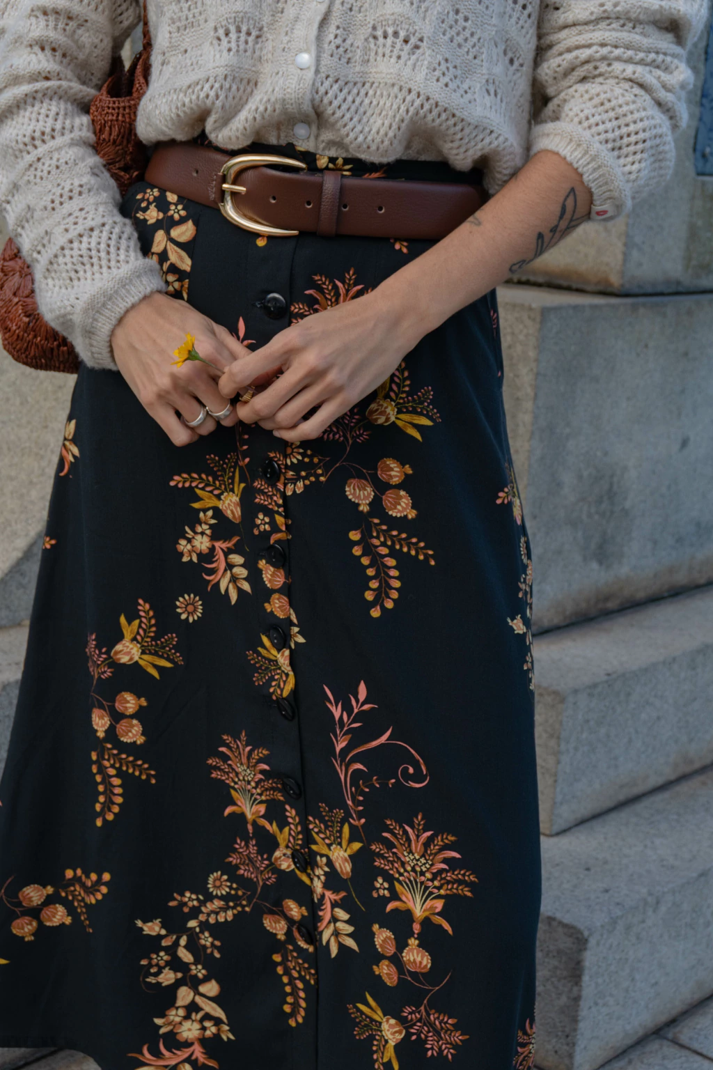 A Saia Garnier é um clássico contemporâneo: floral sofisticado em tons dourados e rosés sobre fundo preto profundo, como um jardim à meia-noite. Com modelagem evasê e cintura marcada, ela tem caimento fluido e elegante — perfeita para criar looks que equilibram feminilidade, presença e movimento.