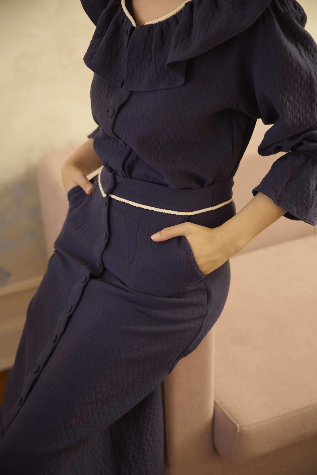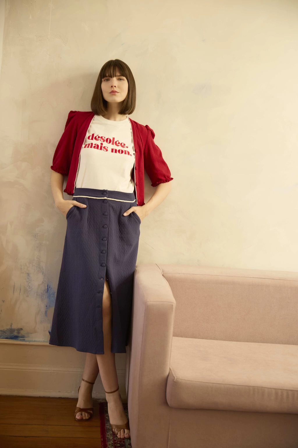 Com modelagem midi e caimento estruturado, a Saia Madeleine combina textura e sofisticação em uma peça icônica da Collection Héritage. Confeccionada em algodão matelassê azul marinho, ela apresenta fechamento frontal com botões forrados e o elegante toque do cordão trançado off white, que adiciona contraste artesanal e assinatura French Stripes ao visual.
