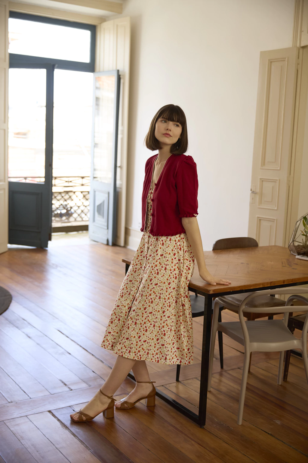 O Vestido Véronique é uma ode à feminilidade e à delicadeza atemporal da Collection Héritage. Inspirado na modelagem consagrada do vestido Elise, apresenta uma nova estampa floral em tons de vermelho e fundo off white, com botões vermelhos que percorrem o fechamento frontal.